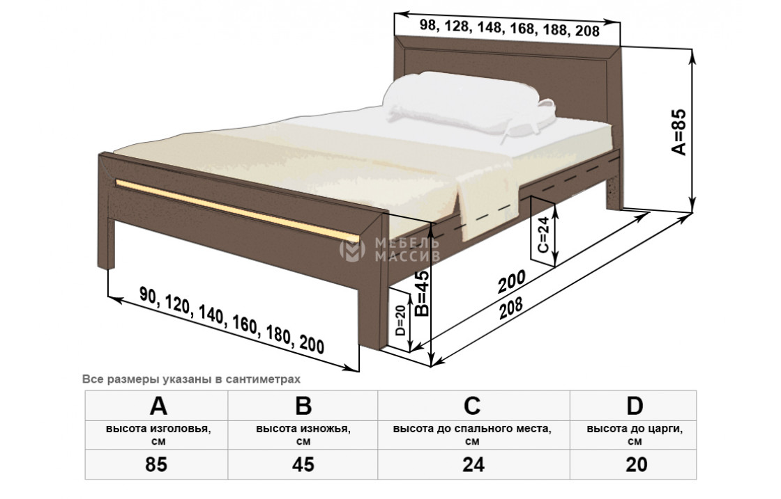 140x200 - глубина уменьшается на 100 мм = 685 мм